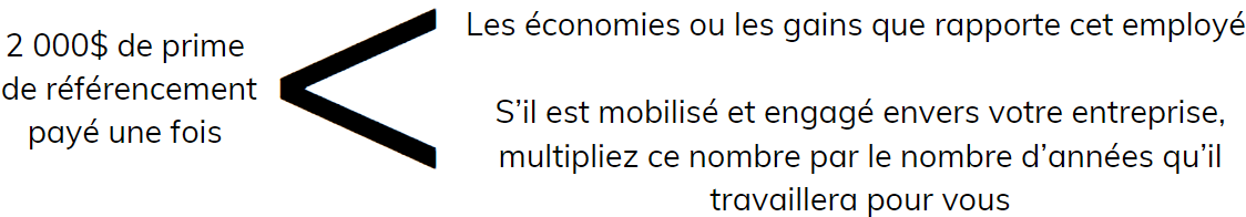 L’objectif est de faire en sorte d’avoir des CV de personnes qualifiées de la part de vos employés. Pour y arriver, on vous propose de diviser le montant total de la prime (et vos employés seront contents de ne pas recevoir une prime dont « la moitié du montant va être mangée par les impôts »):